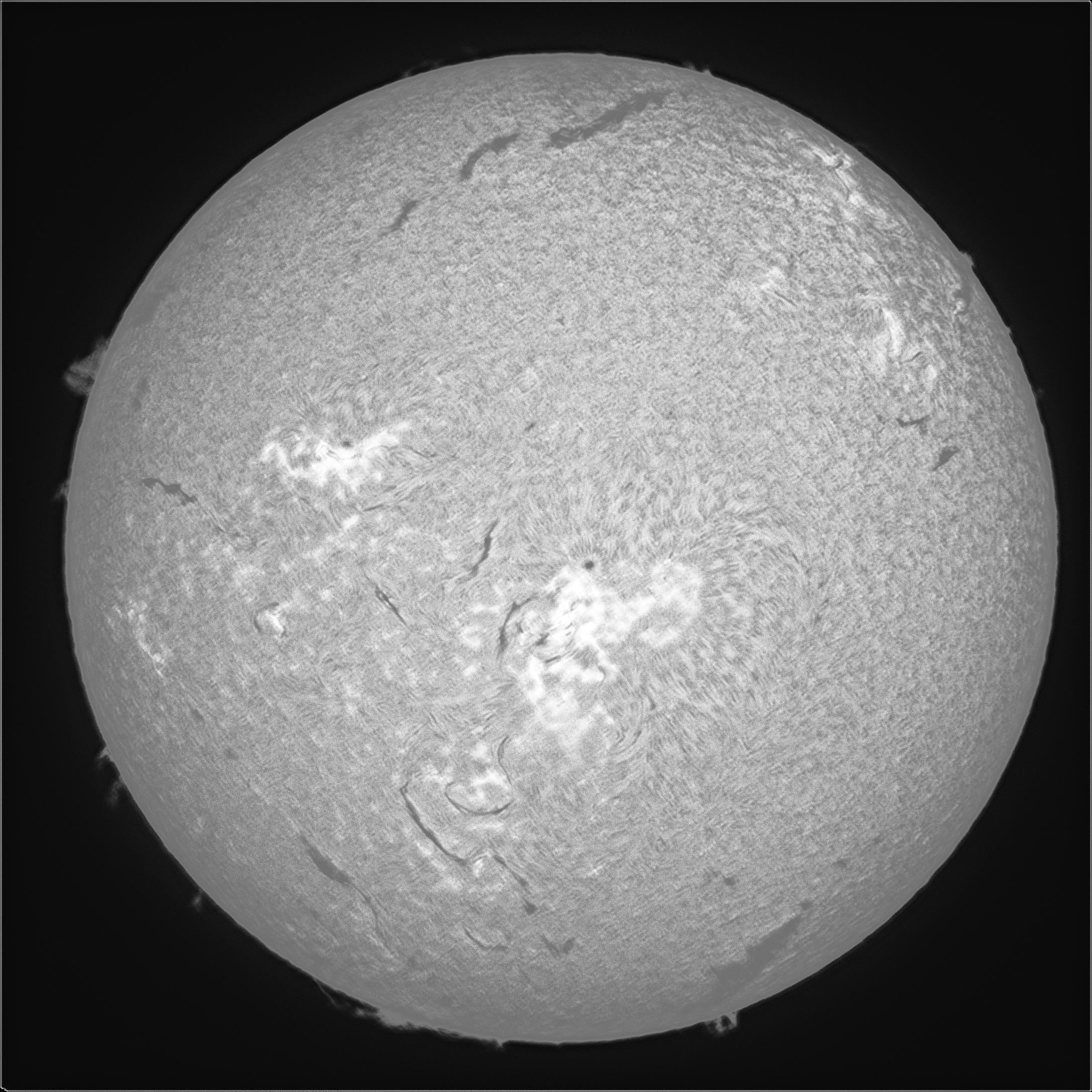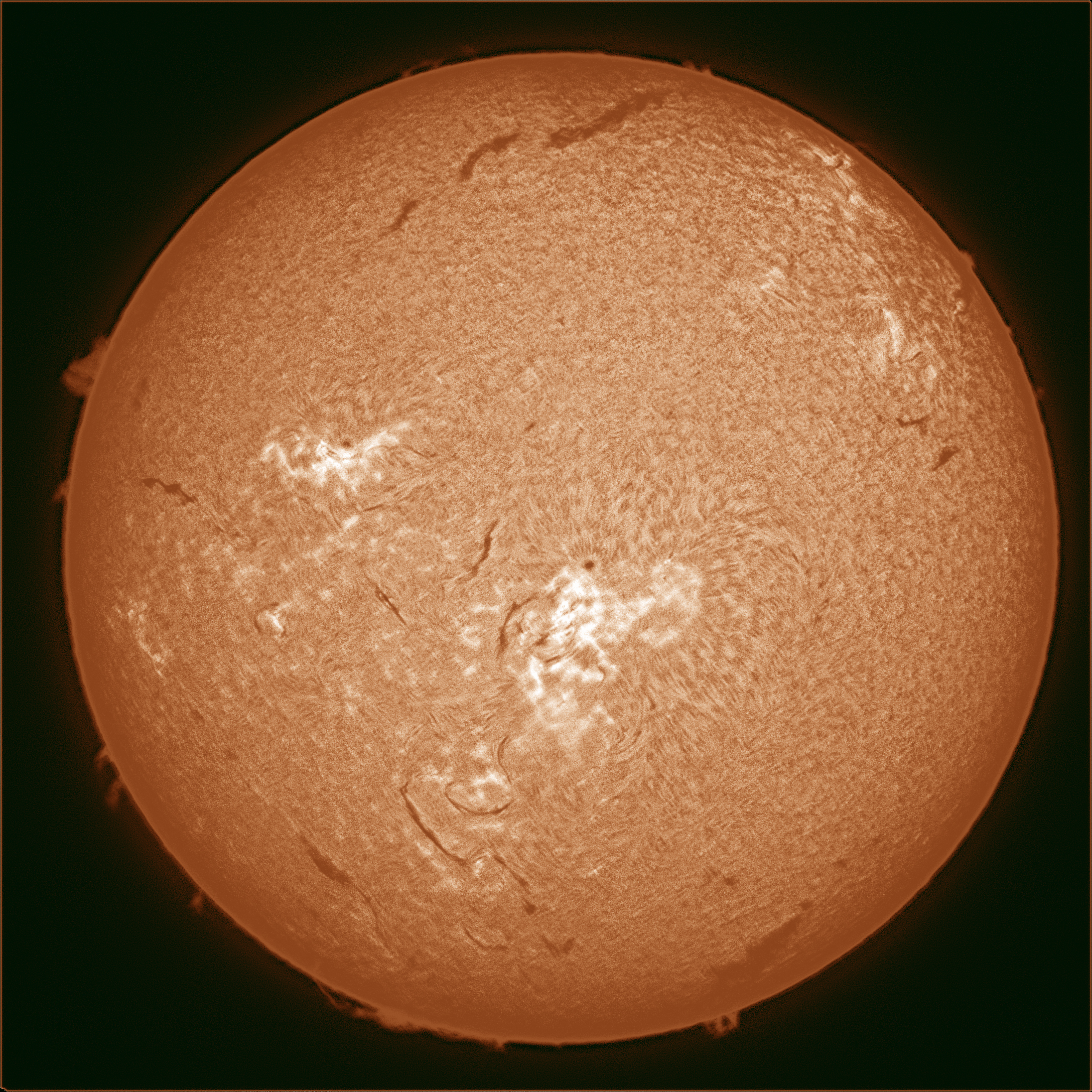 8時51分 フェニックス400mm太陽望遠鏡 ZWO ASI678MM Capture Area=2160×2160 Colour Space=MONO16 Gain=112 Exposure=2.7540ms Duration=117.835s FrameCount=3000 AS!4(20%) Registax6(ウェーブレット強調し過ぎ)Photoshop(トーンカーブ、着色)